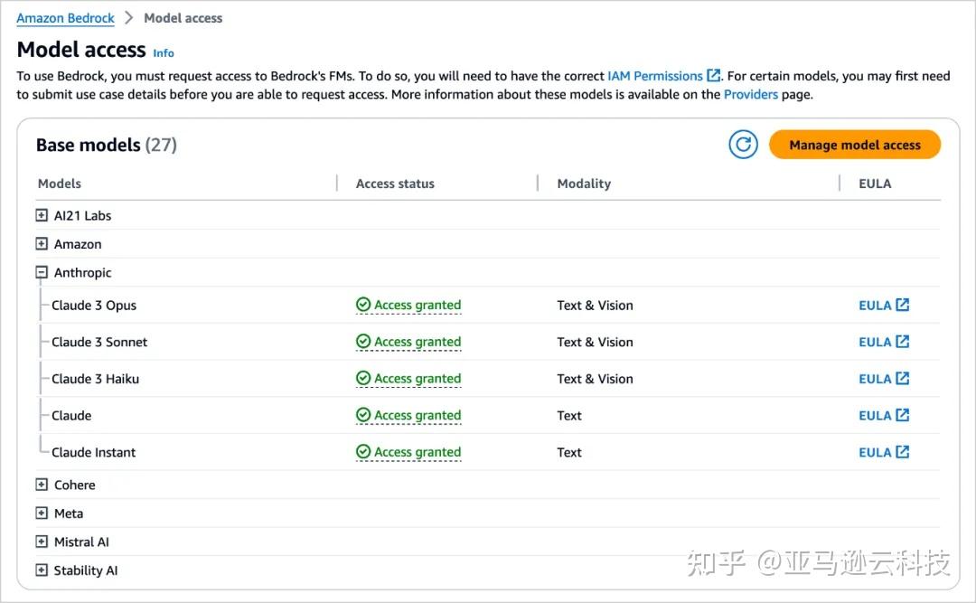 如果您是第一次使用 Anthropic 模型,请前往 Amazon Bedrock 控制台,在左下角面板中选择“Model access”。请单独申请对 Claude 3 Opus 的访问权限。