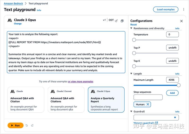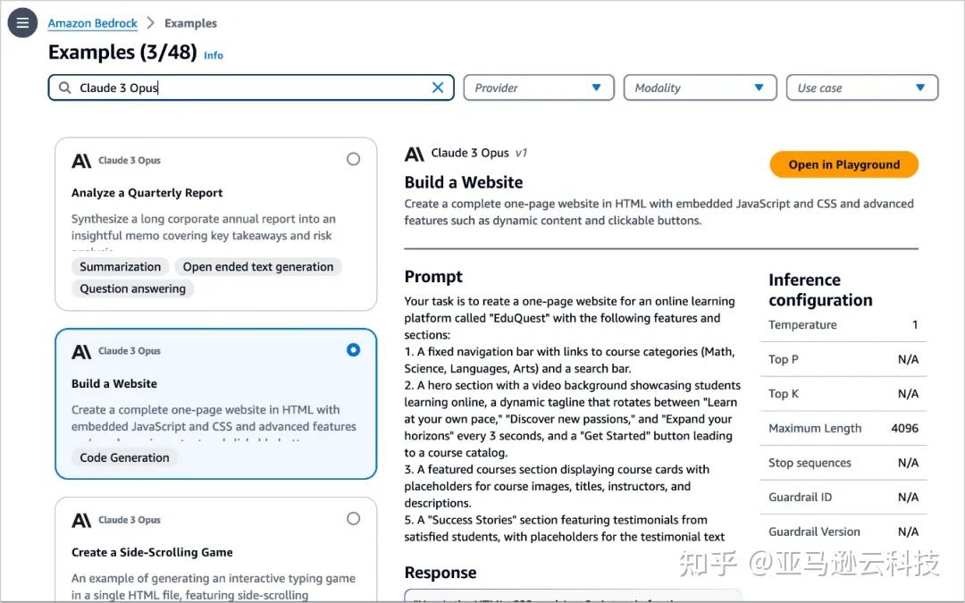 要测试更多 Claude 提示示例,可以选择“Load examples”。您将能够查看并运行专门针对 Claude 3 Opus 的示例,例如分析季度报告、构建网站以及创建横向滚动游戏等。