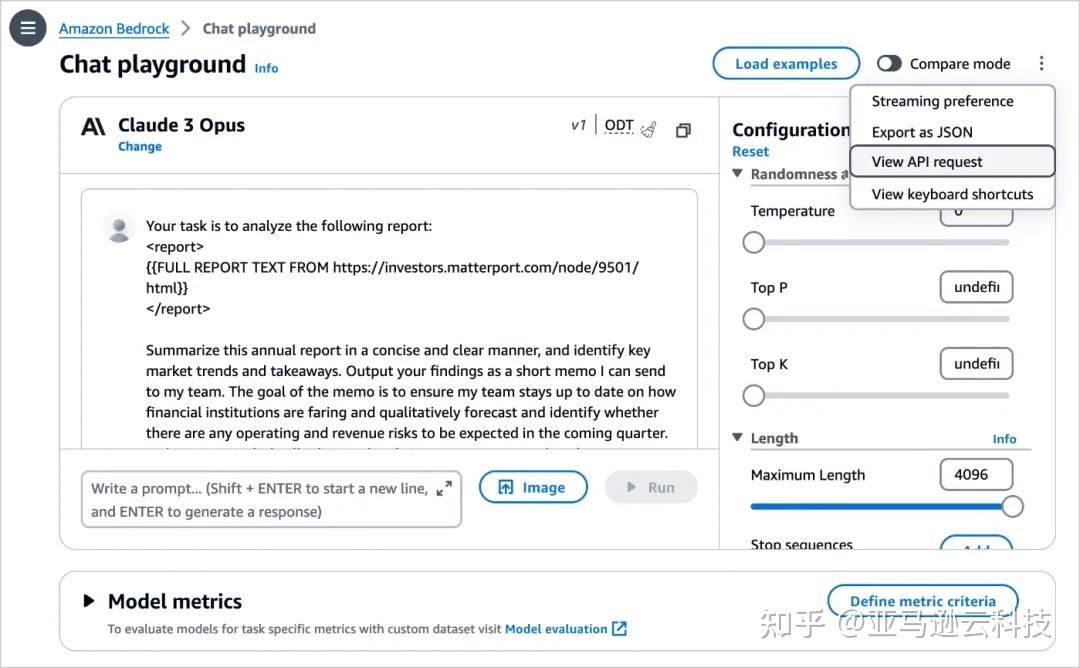 通过选择“View API request”,您还可以使用亚马逊云科技命令行界面(Amazon CLI)和 Amazon SDK 中的代码示例来访问该模型。以下是 Amazon CLI 命令的一个示例: