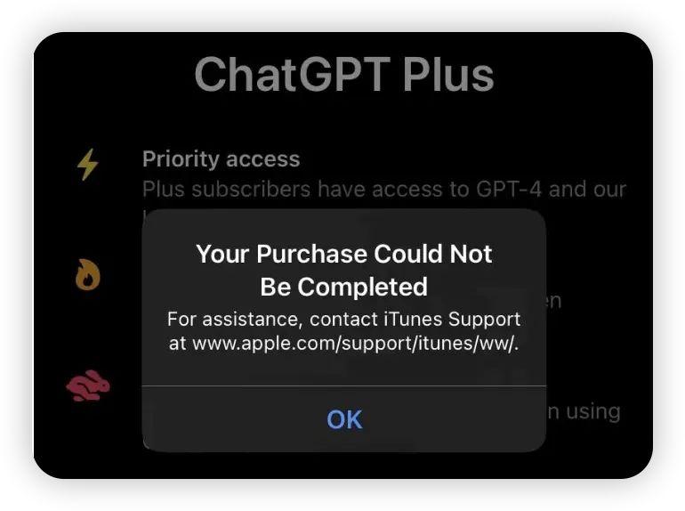 通过购买礼品卡,升级ChatGPT plus,也有失败的风险。众所周知,苹果和PayPal是两家风控最严的公司。当识别到你的Apple ID账号有风险,就会进行冻结,让你在第一步支持的时候失败,会有如下提示: