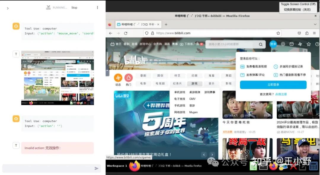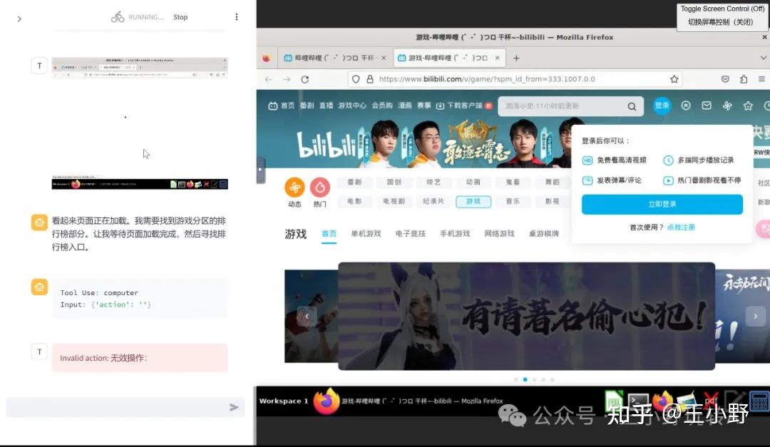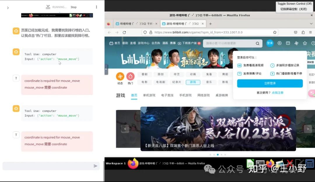 首先AI对图像内容的理解存在局限性,其次一些简单的操作如滚动、拖拽、缩放等的成功率也并不高,尤其是在面对复杂或不规则的用户界面时。拿“找到b站游戏榜排行前10视频”的任务为例,AI明明正确决策了下一步,但就是卡在了点击这个操作上,而且我重复试验了3次都失败了,看得人干捉急。
