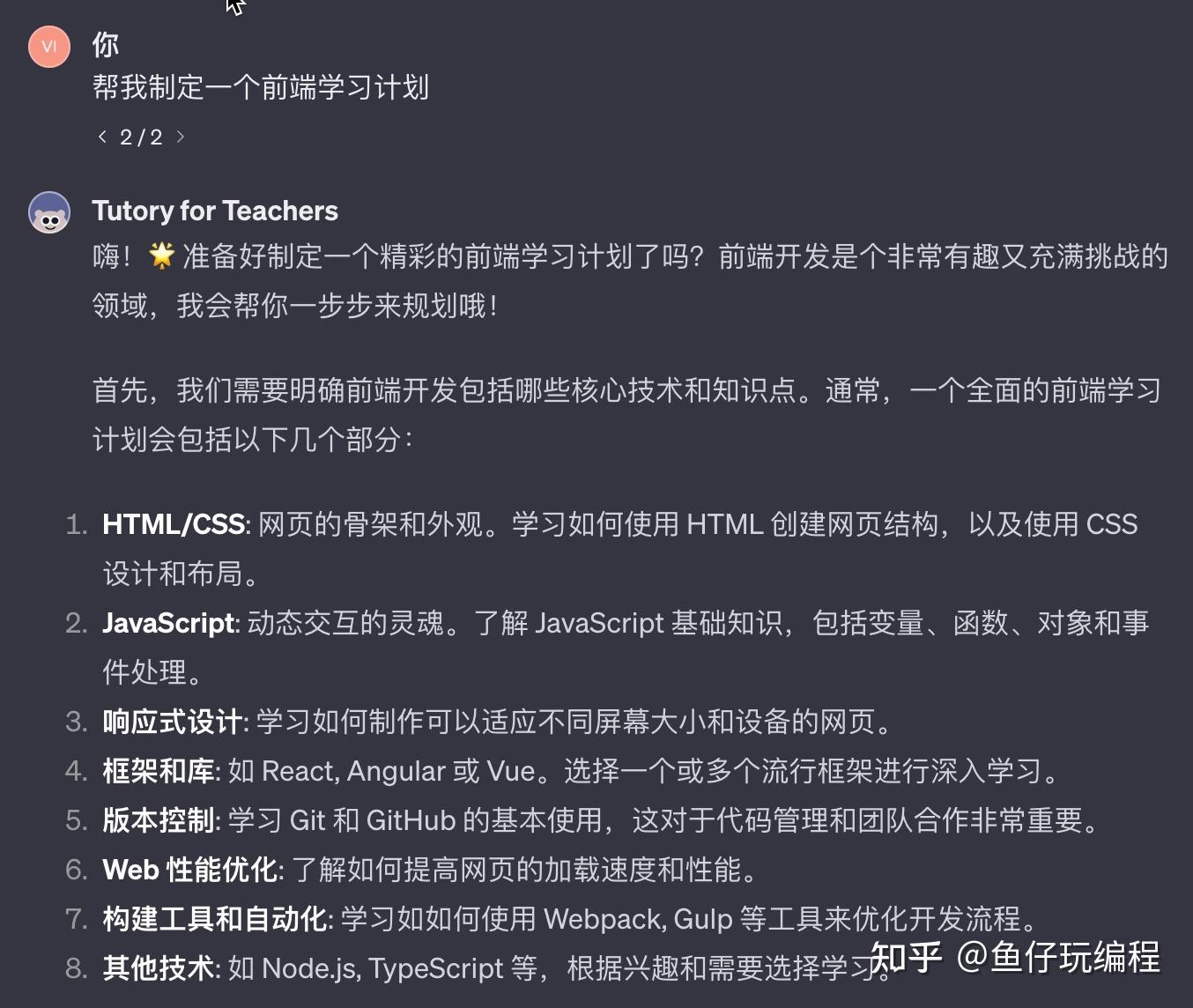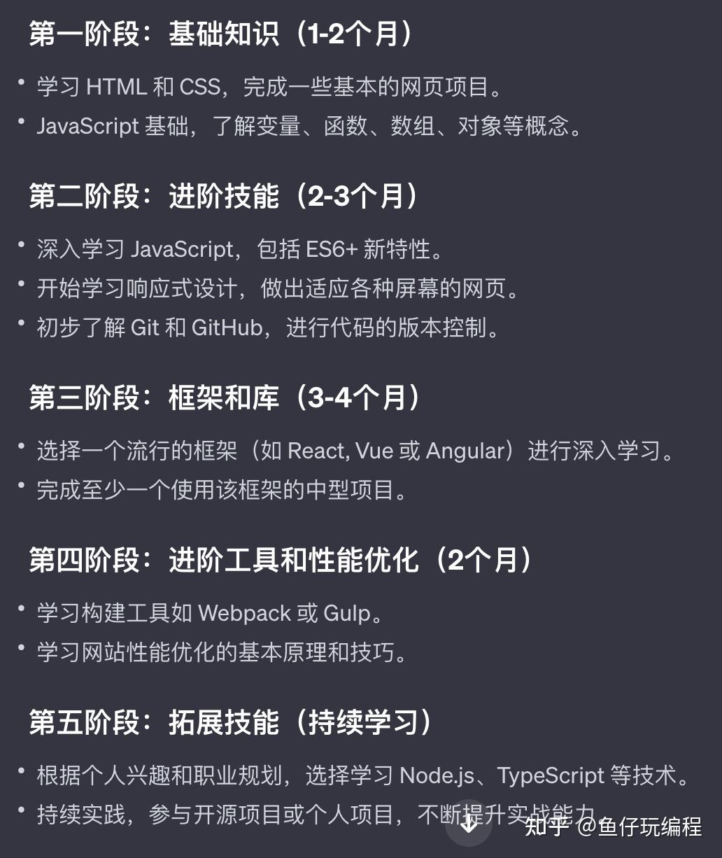 这个插件可以为个人制定学习路径,我让他为我制定一个前端学习计划,看起来确实有模有样,但是感觉和网上的学习路线比,确实不够细节详细,不过网上的都是各位大佬花了许多时间收集整理的。