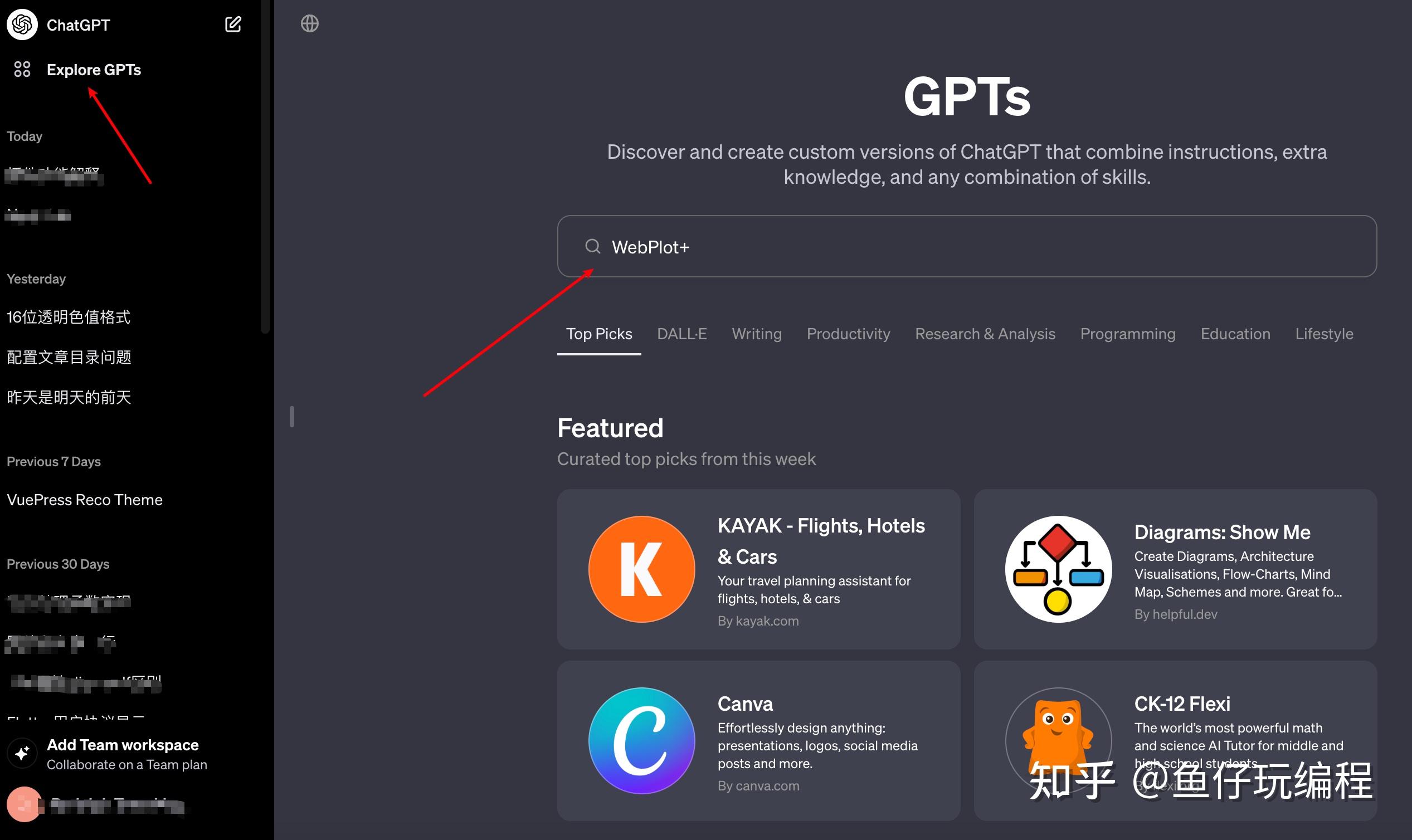 如图,升级chatgpt4之后,点击explore gets,然后在输入框中搜索自己需要的插件就可以。