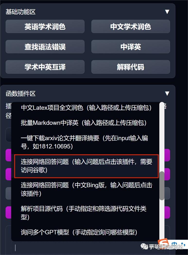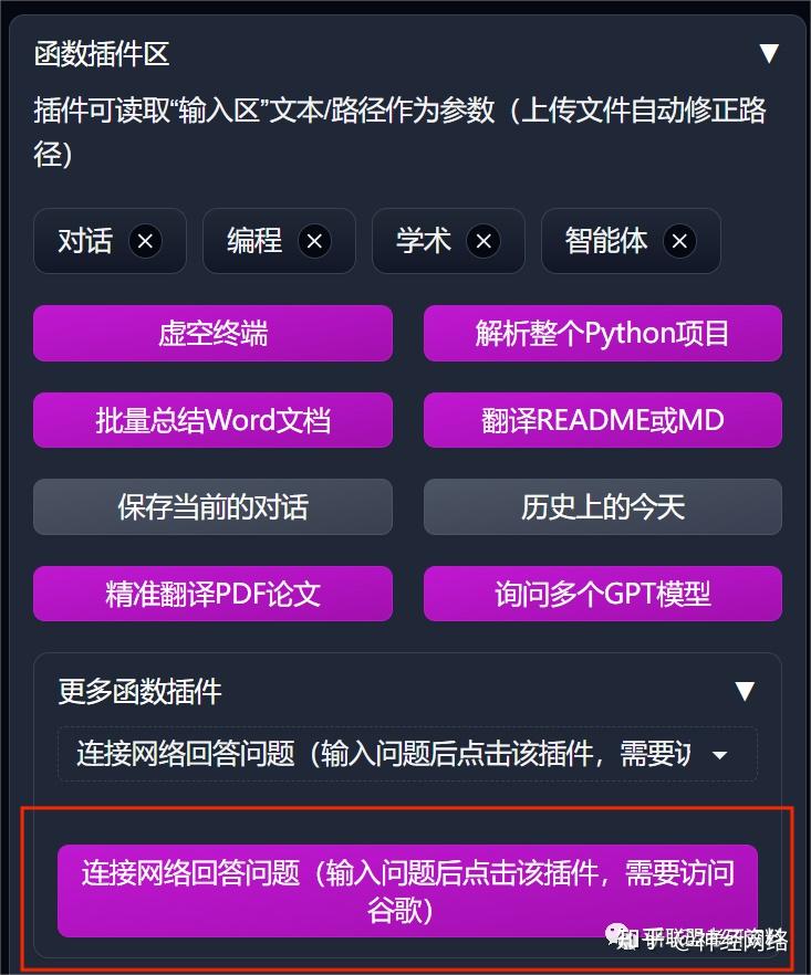 具体操作:更多插件区,选择连接网络回答需要谷歌访问插件,对话框输入你想检索的内容,点击粉色连接网络回答插件即可(注意:不是点橙色的提交按钮,而是点下方的粉色插件)。