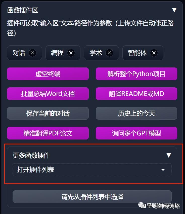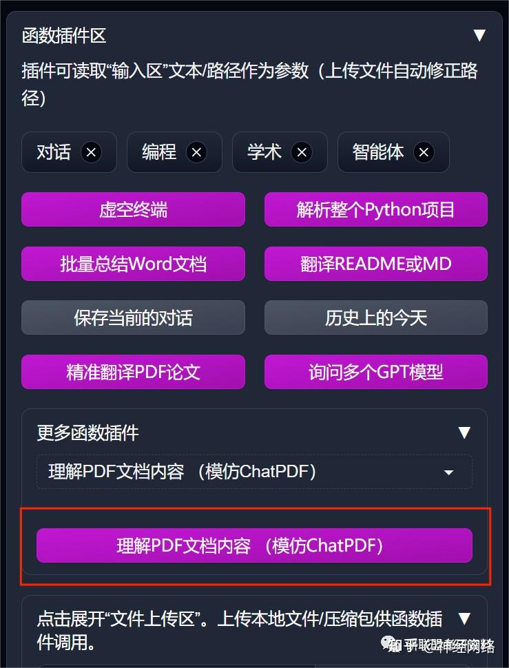 3.2.1上传文件后,选择更多函数插件区,找到理解PDF文档内容插件(模仿ChatPDF),然后点击粉色的理解PDF文档内容插件,