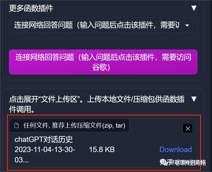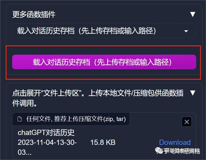 具体操作:函数插件区,选择保存当前对话,下载对话到本地,下次使用时请在上传区上传这个对话文件,选择更多插件区,