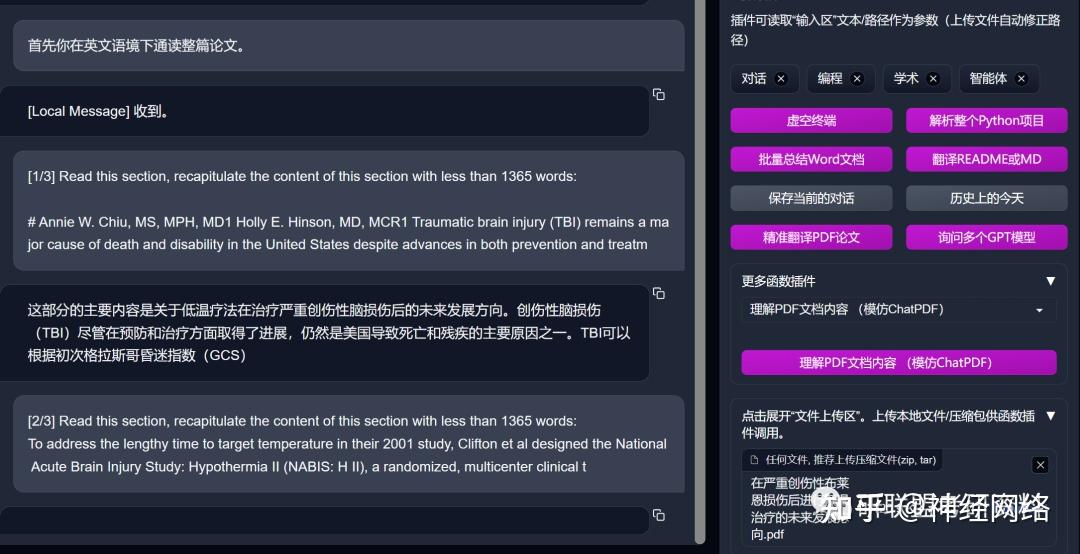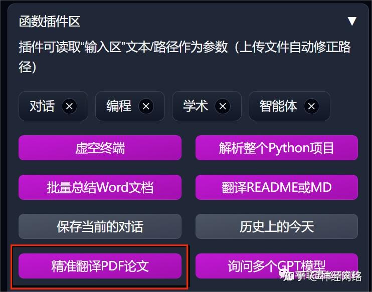 具体操作:上传文件后,点击函数插件区,选择精准翻译PDF论文插件,点击即可。