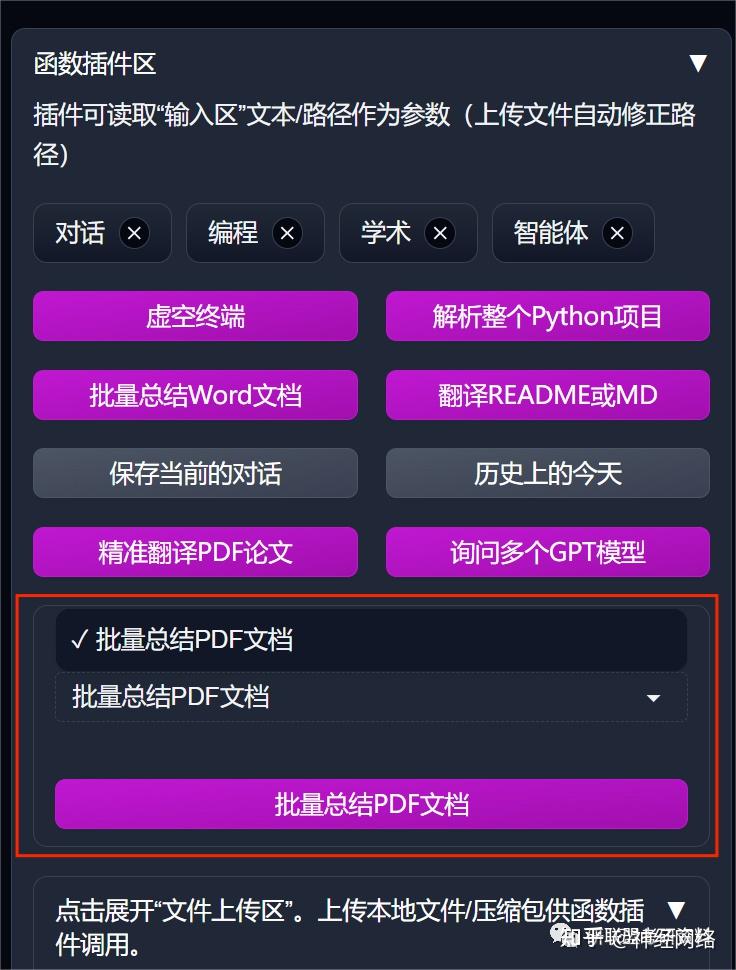 具体操作:同时选择2-3篇PDF文档一起上传,或者新建文件夹将2-3篇PDF用.zip压缩包的形式上传到模型上传区;选择更多函数插件区,找到总结PDF文档插件,然后点击粉色的总结PDF文档插件。