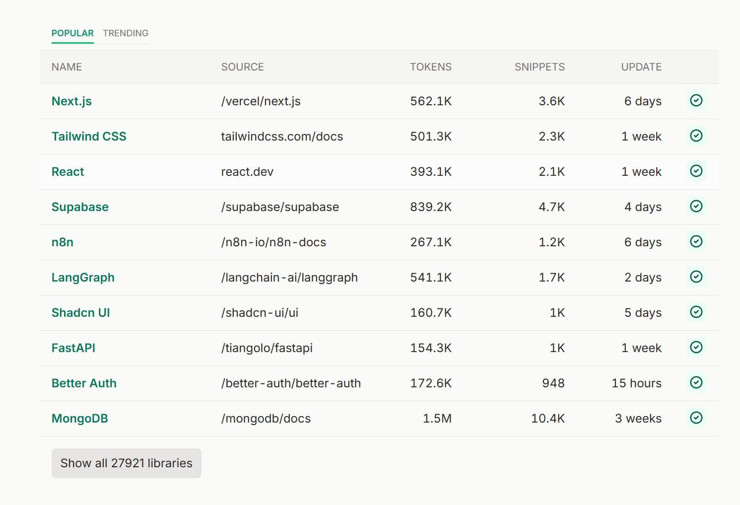 它可以为大模型和 AI 代码编辑器提供最新(或者特定版本)的文档、库、代码、信息等,避免使用过时的数据,到目前为止,官网已经收录了 27921个库,并支持手动添加自己的库。