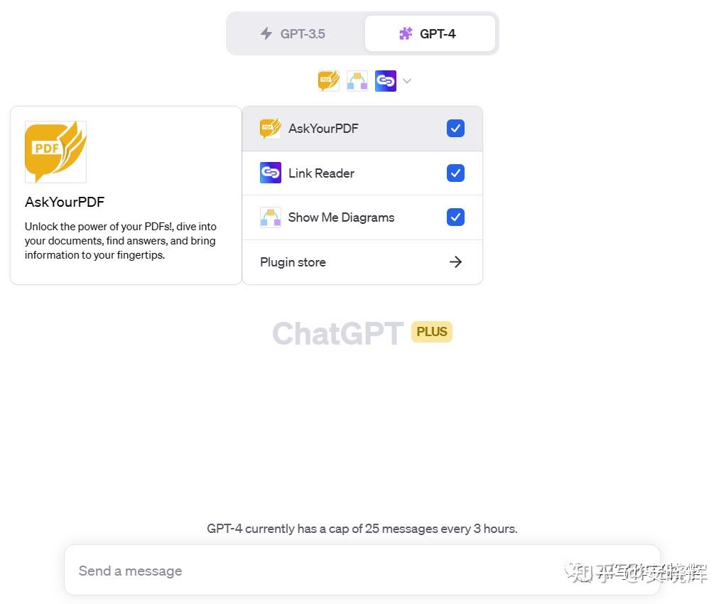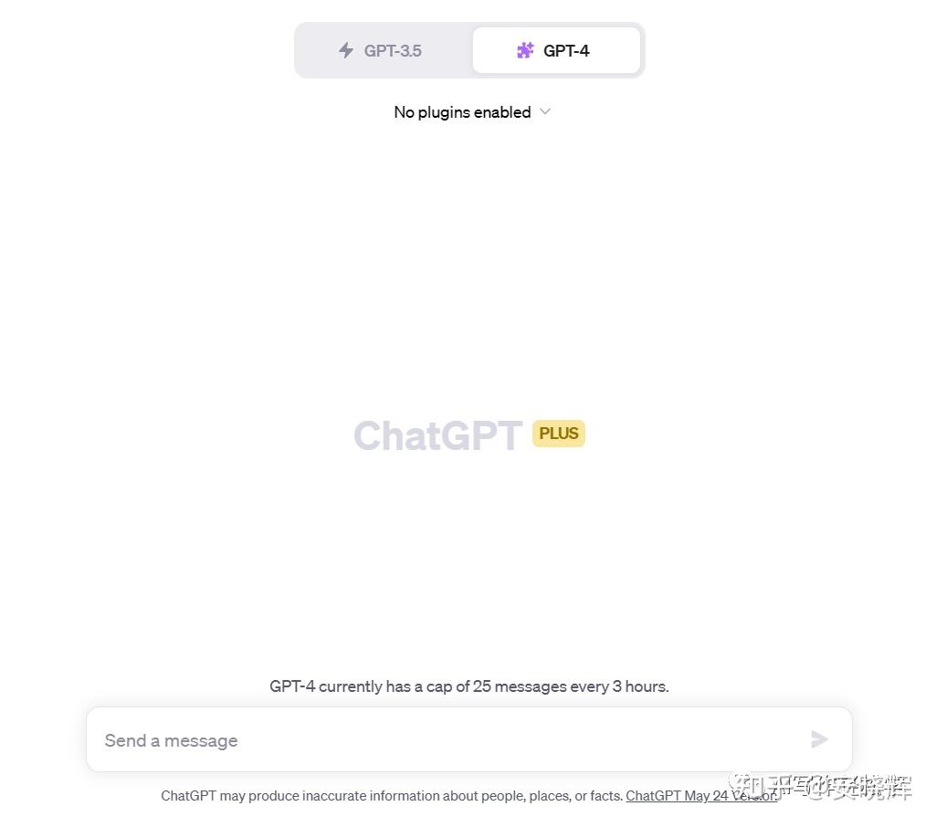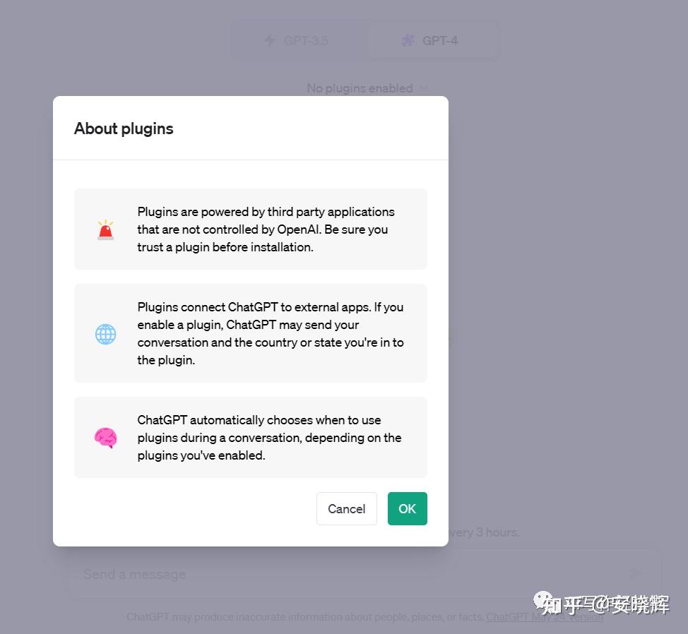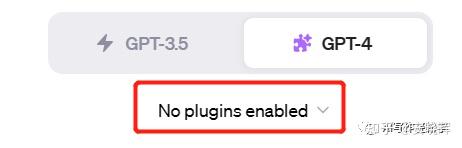 第一次使用ChatGPT Plus的GPT-4模型,使能Plugins功能,因为你还没有安装插件,会出现下面的界面,显示“No plugins enabled”。