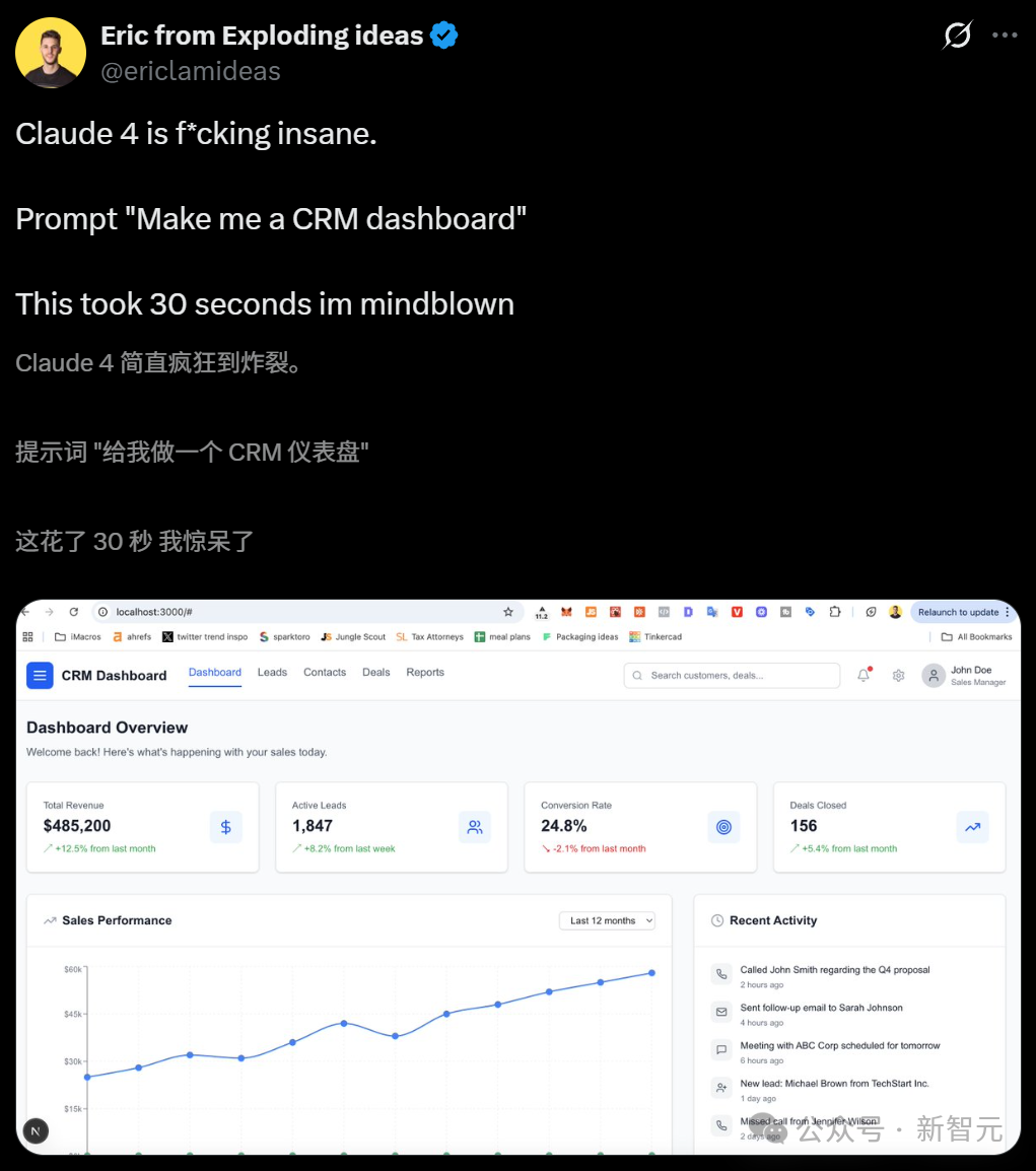 比如用Claude 4制作一个CRM仪表板,只需30秒,速度直接让人瞳孔地震。