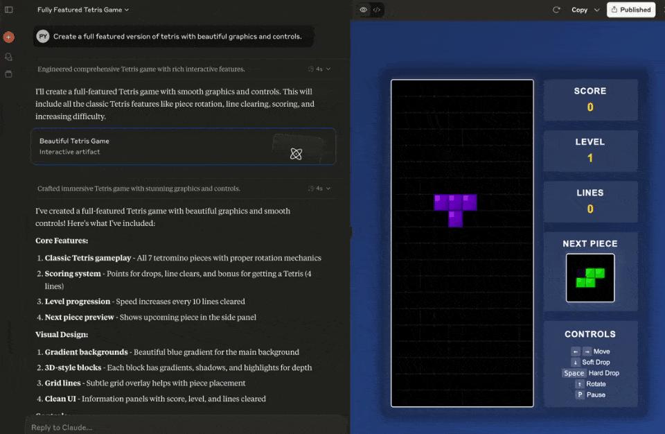比如,它一次性就构建了一个俄罗斯方块游戏。