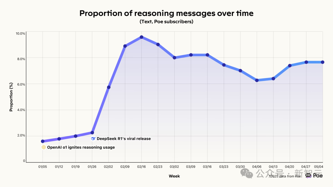 随着新模型带来的用户兴趣的提升,推理类信息的比例在2025年初大幅上升