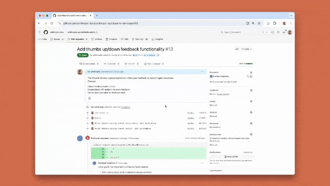 可以看到,在PR(拉取请求)中标记Claude Code,它就能响应审查者反馈、修复CI错误或修改代码。