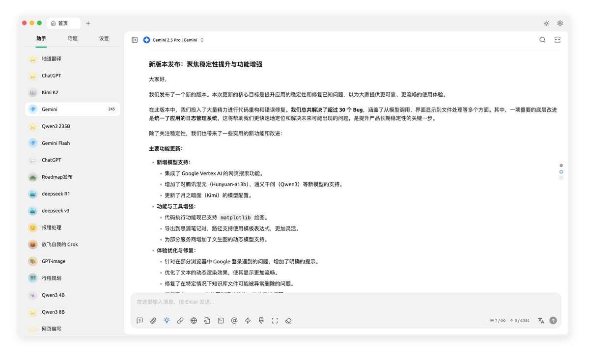 新版本还增加了浮动侧边栏,方便快速切换模型和助手;改进了文字流式输出体验;引入了由Alibaba Cloud EDAS团队提供的Trace(调用链路可视化)功能,并在开发者模式下可查看Trace数据。此外,还修复了多模型对比时不能横向滑动的问题,并进行了其他错误修复和性能优化。