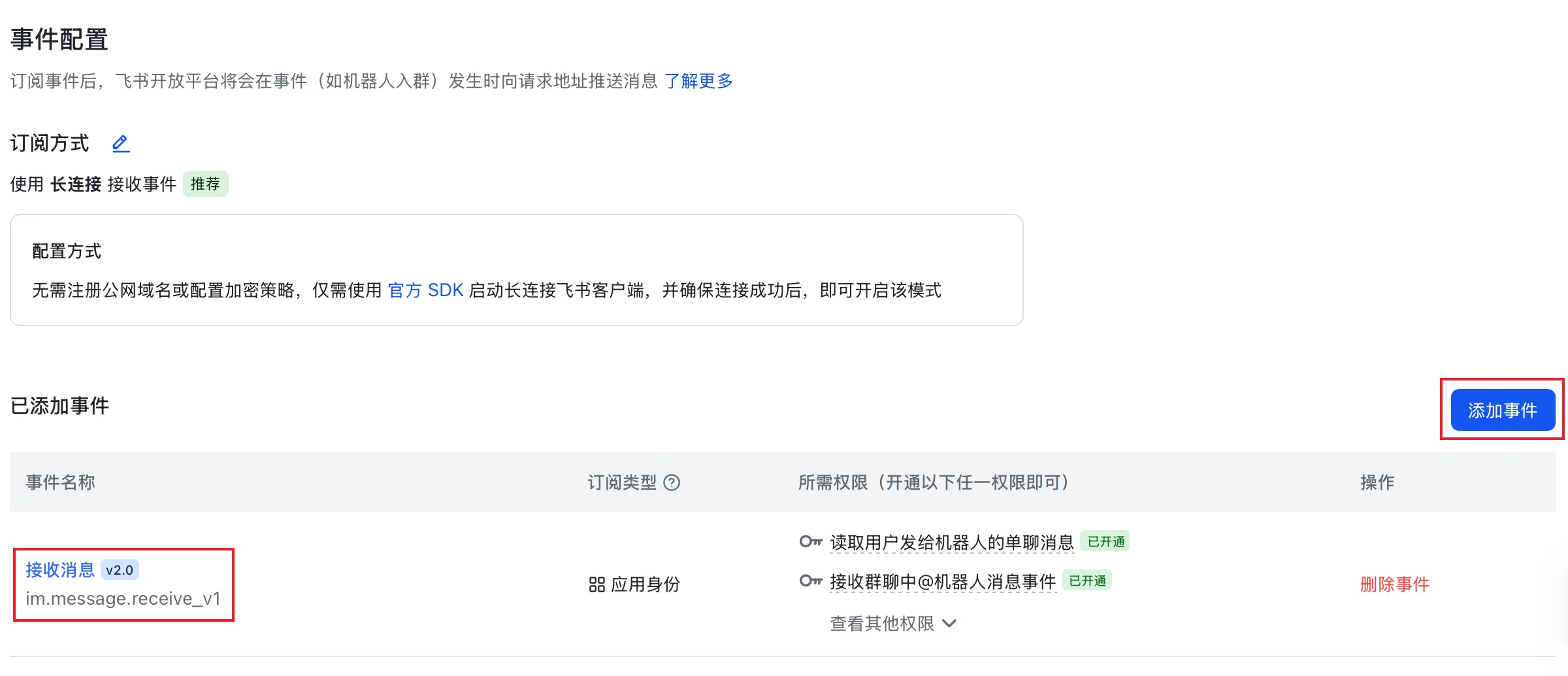 点击添加事件,添加一个叫做 im.message.receive_v1 的事件。