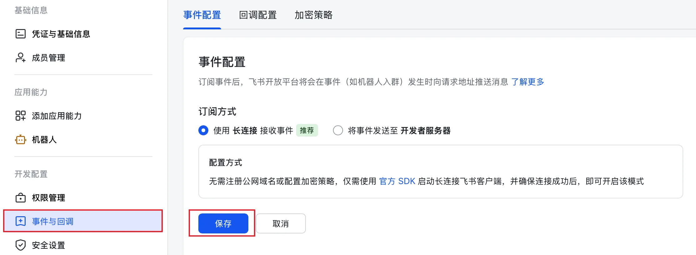 在事件配置的订阅方式中,选择使用长连接接收事件,点击保存。