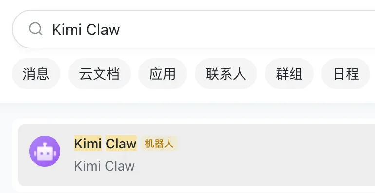 现在打开你的手机或者电脑版飞书,搜索 Kimi Claw 就能看到创建好的机器人了。