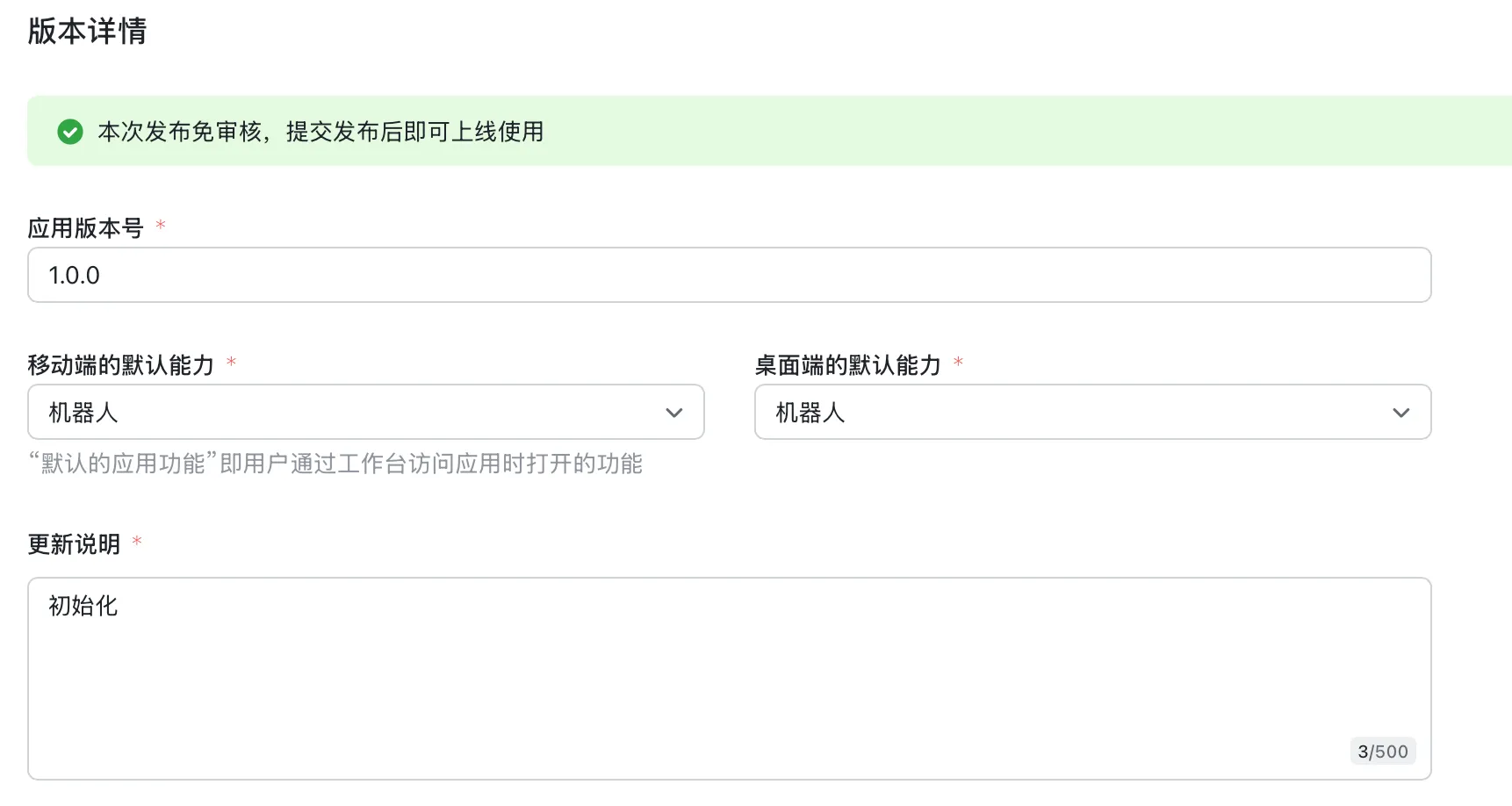 随便输入一个应用版本号和更新说明。