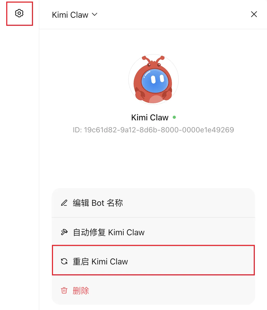 发送给 Kimi Claw 之后,点击右上角的配置按钮,手动重启一下。