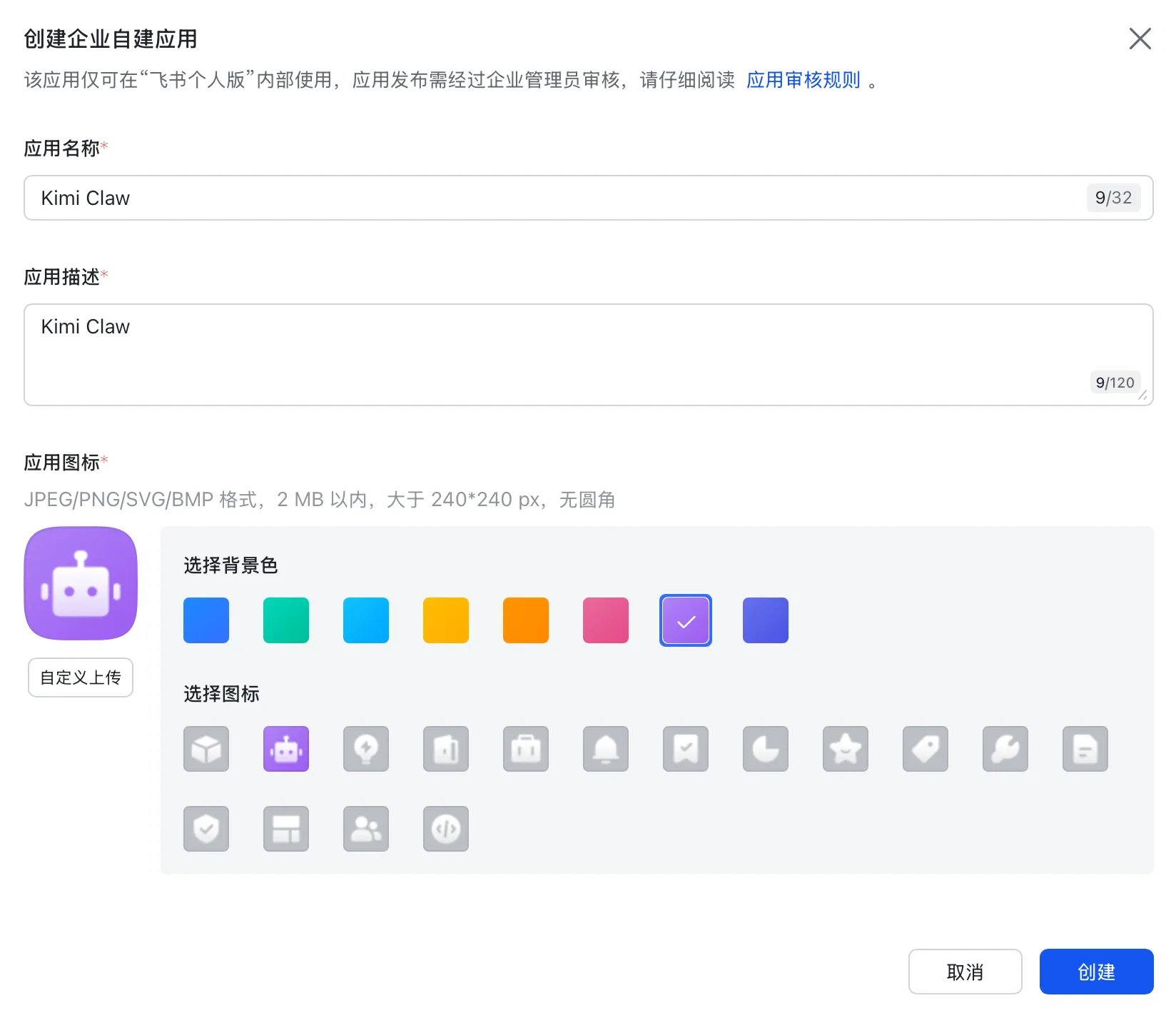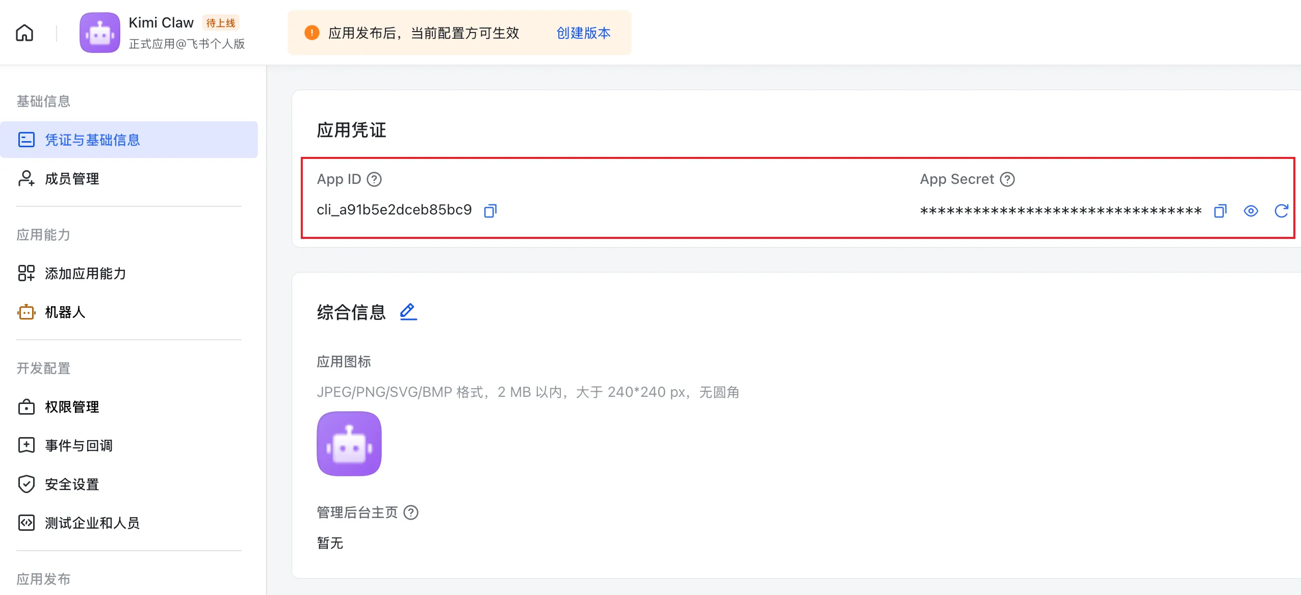 通过 Kimi Claw 提供的链接,直接跳进下面的飞书开放平台。