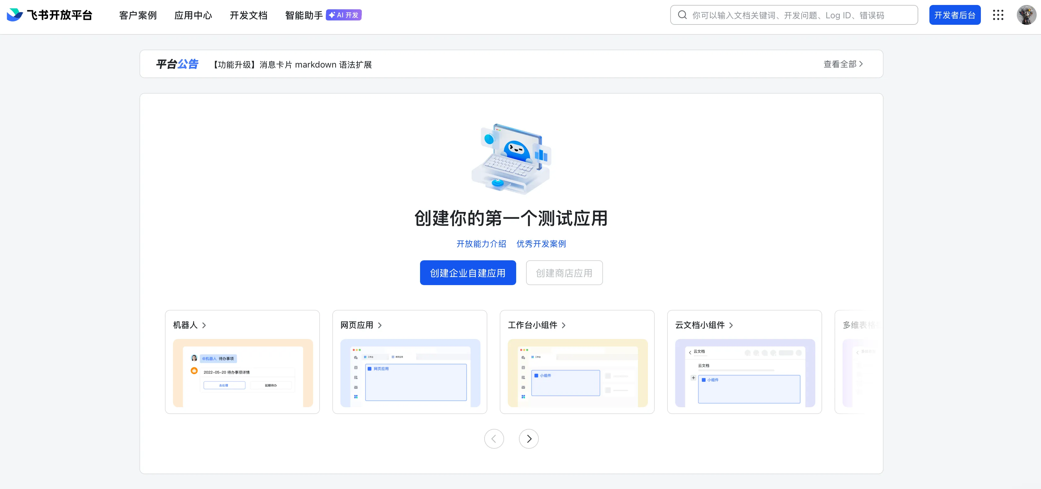 点击中间的蓝色按钮,创建企业自建应用。