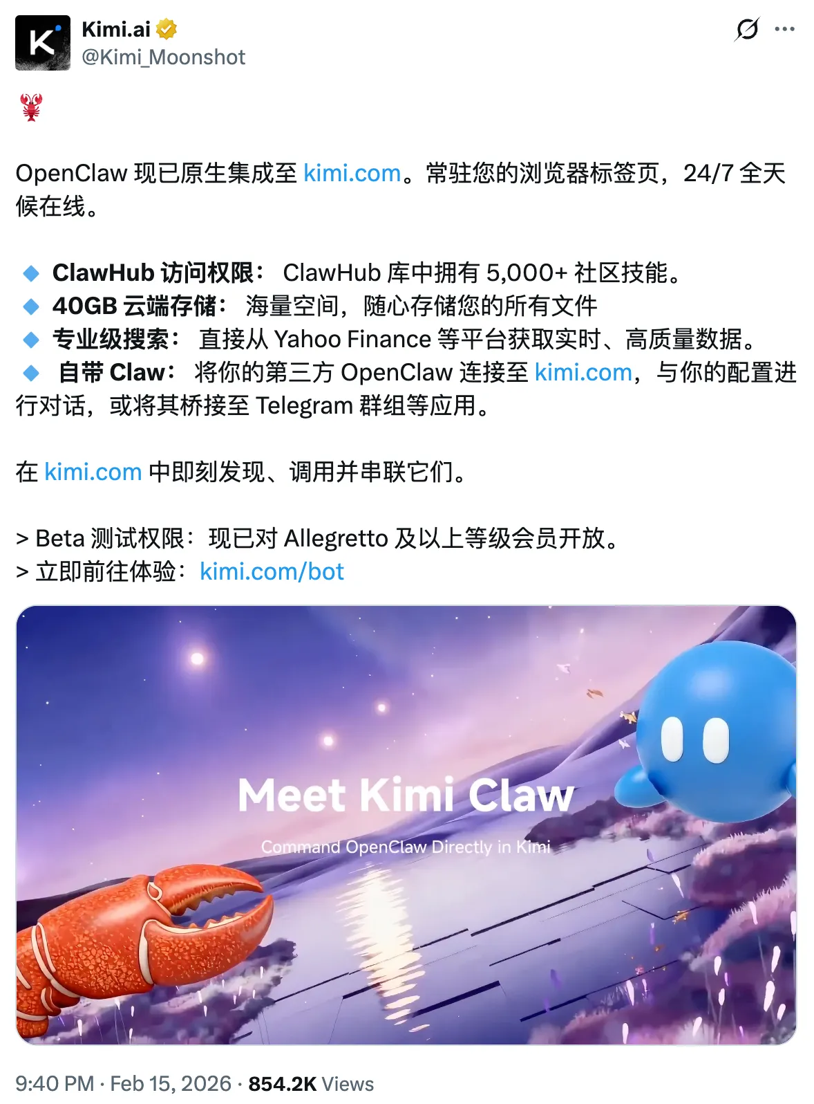 就在刚刚,Kimi 居然把最近全球火爆的龙虾 OpenClaw 给接入了。
