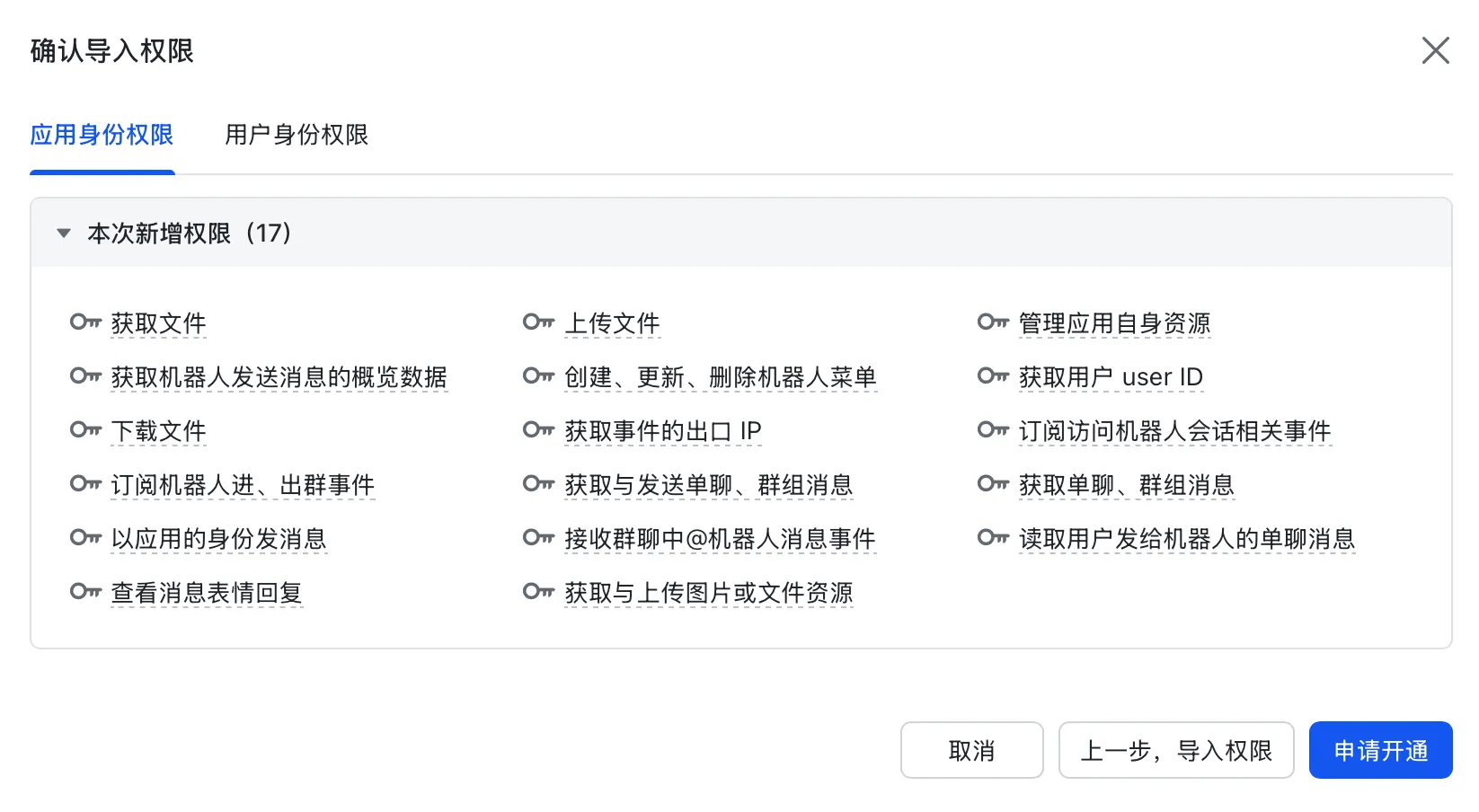 讯享网"tenant": [ "aily:file:read", "aily:file:write", "application:application.app_message_stats.overview:readonly", "application:application:self_manage", "application:bot.menu:write", "contact:user.employee_id:readonly", "corehr:file:download", "event:ip_list", "im:chat.access_event.bot_p2p_chat:read", "im:chat.members:bot_access", "im:message", "im:message.group_at_msg:readonly", "im:message.p2p_msg:readonly", "im:message:readonly", "im:message:send_as_bot", "im:message.reactions:read", "im:resource" ], "user": ["aily:file:read", "aily:file:write", "im:chat.access_event.bot_p2p_chat:read"]