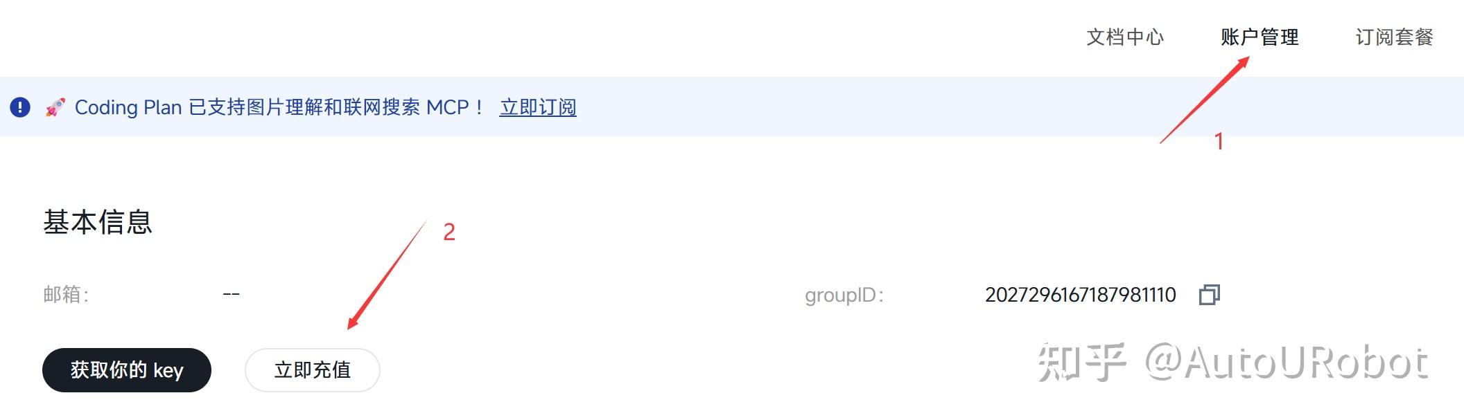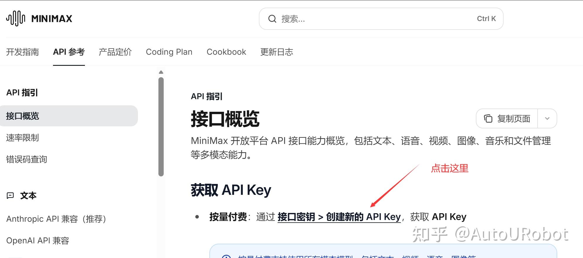 获取MiniMax API的步骤: 登录网址 https:// platform.minimaxi.com/d ocs/api-reference/api-overview ,根据以下步骤获取API密钥,注意要充点钱才能使用,第一次充值会送15元。