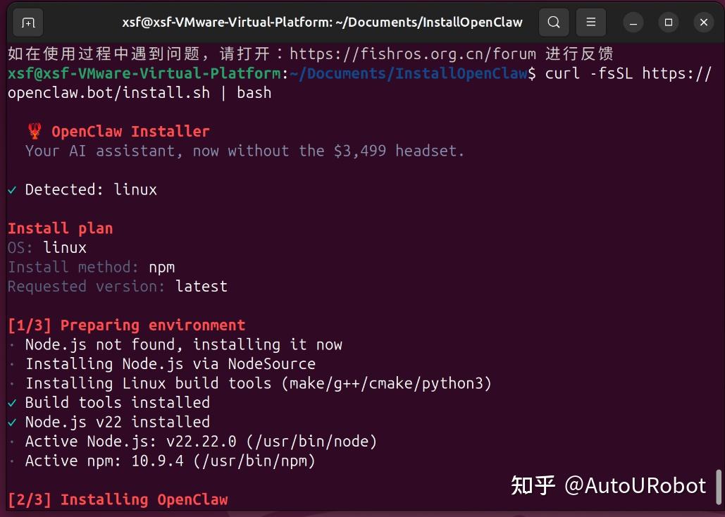 本文将基于 VMware + Ubuntu 24.04 环境,从零开始完成 OpenClaw 的安装、配置,并实现与飞书机器人的打通。
