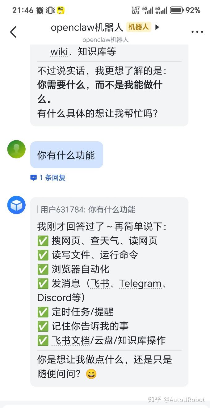再次进行对话,发现openclaw机器人可以回复啦