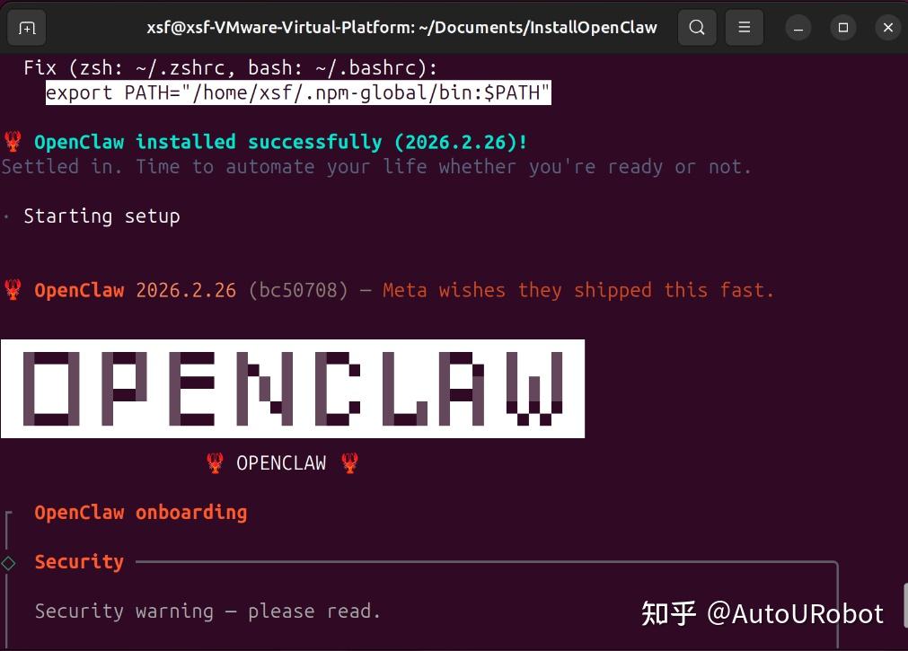 等待安装好后,终端会自动弹出配置界面。此外,为了后续能在终端识别openclaw的命令,需要在~/.bashrc文件添加export PATH=“/home/xsf/.npm-global/bin:$PATH”。