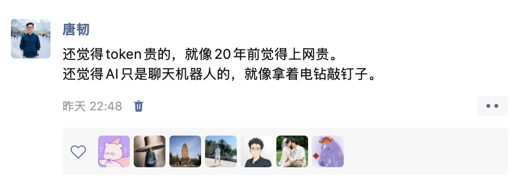虽然现在很多人觉得 OpenClaw 反应慢,AI 大模型 token 贵,但这也是早期阶段。