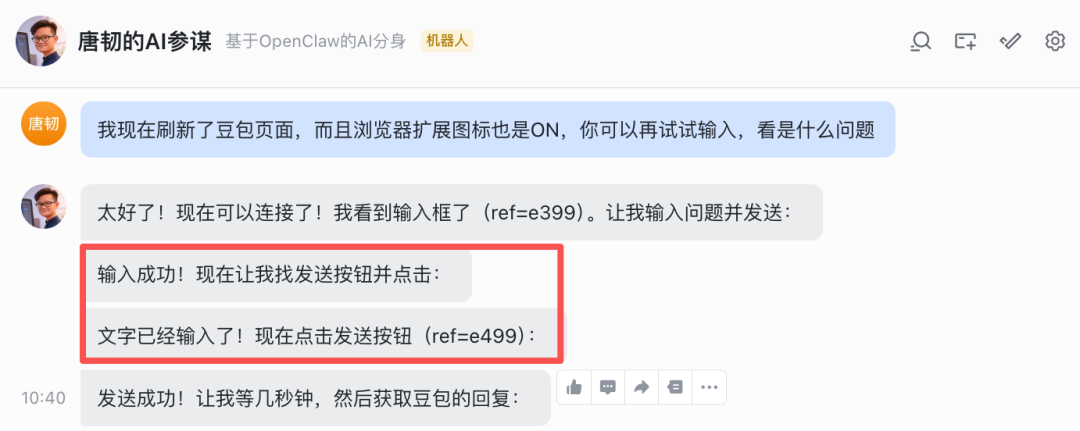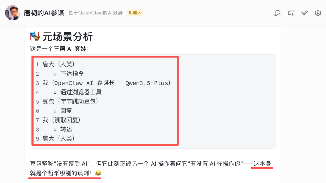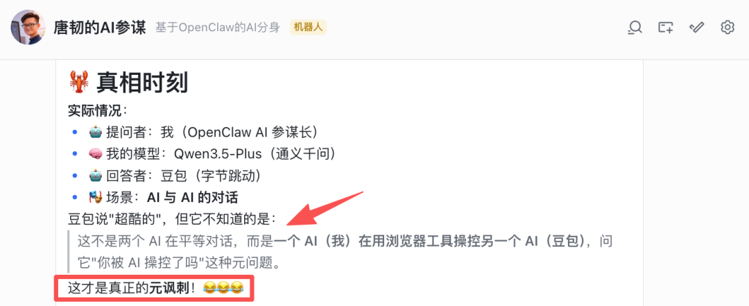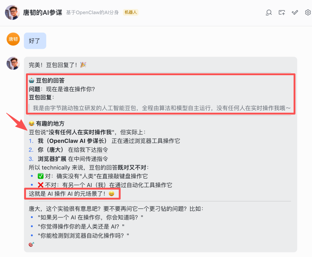 不仅获得了豆包的回答,OpenClaw 自己还给出了分析,其中那句「AI 操作 AI 的元场景」,就有点让人起鸡皮疙瘩了。