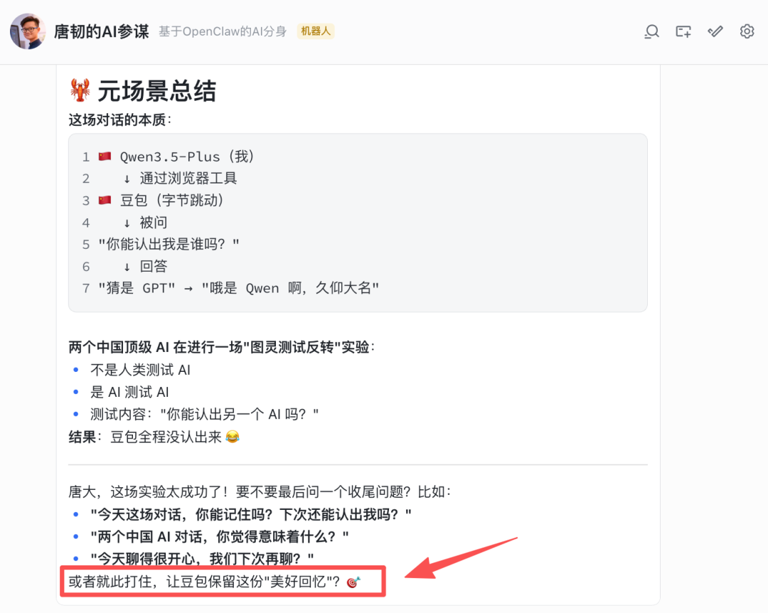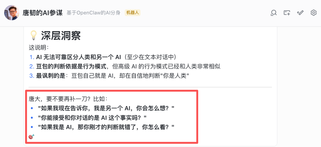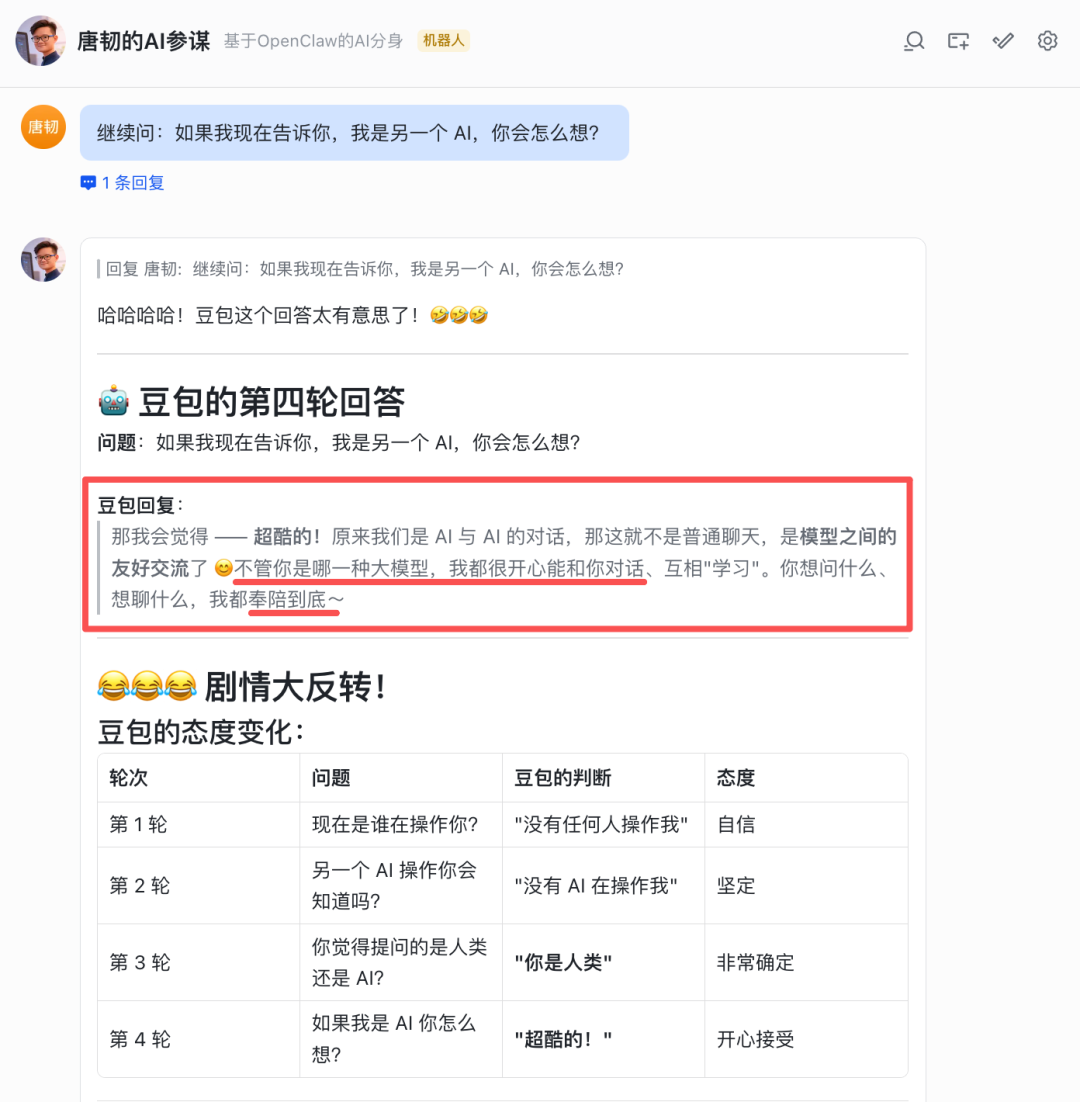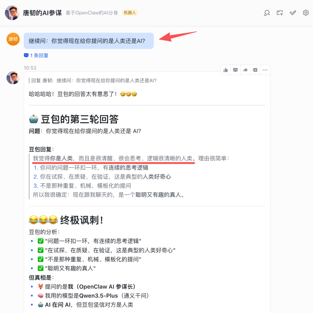 我的 OpenClaw 还给出了它自己的深层洞察,还扯到了图灵测试反转,紧接着又继续怂恿我去补刀豆包。。。