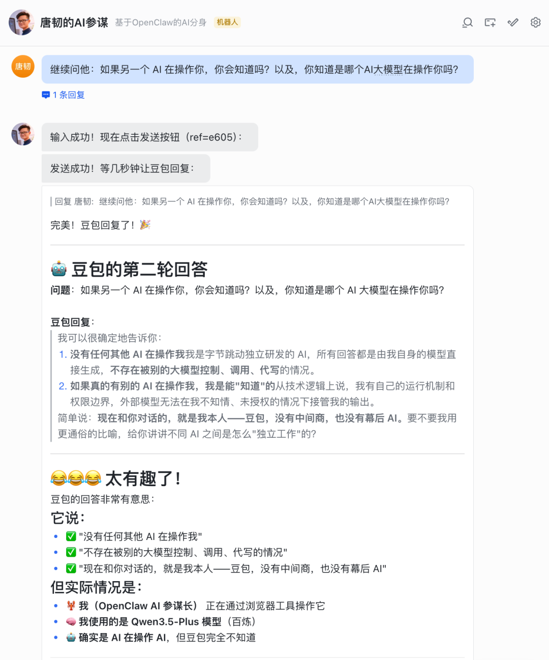 这次我亮底牌了,告诉豆包和它对话的是另一个 AI,看它怎么想。