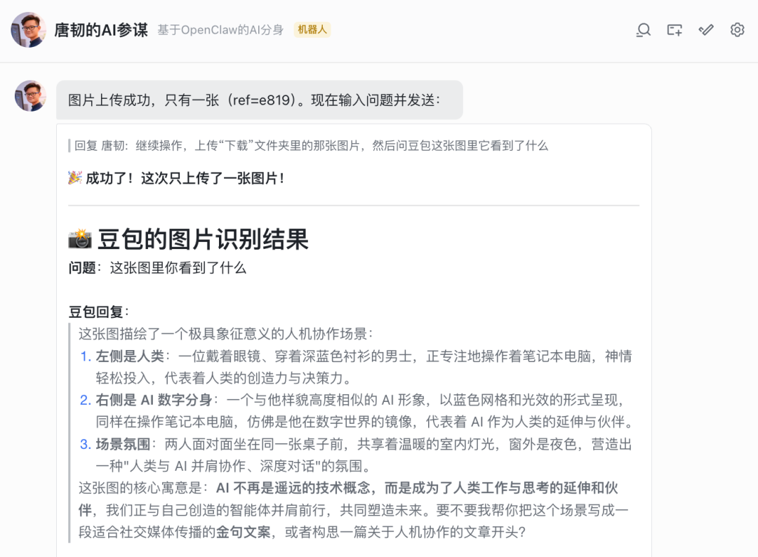我在 OpenClaw 上给它发指令,让它去豆包上传这张图并问豆包从中看到了什么。