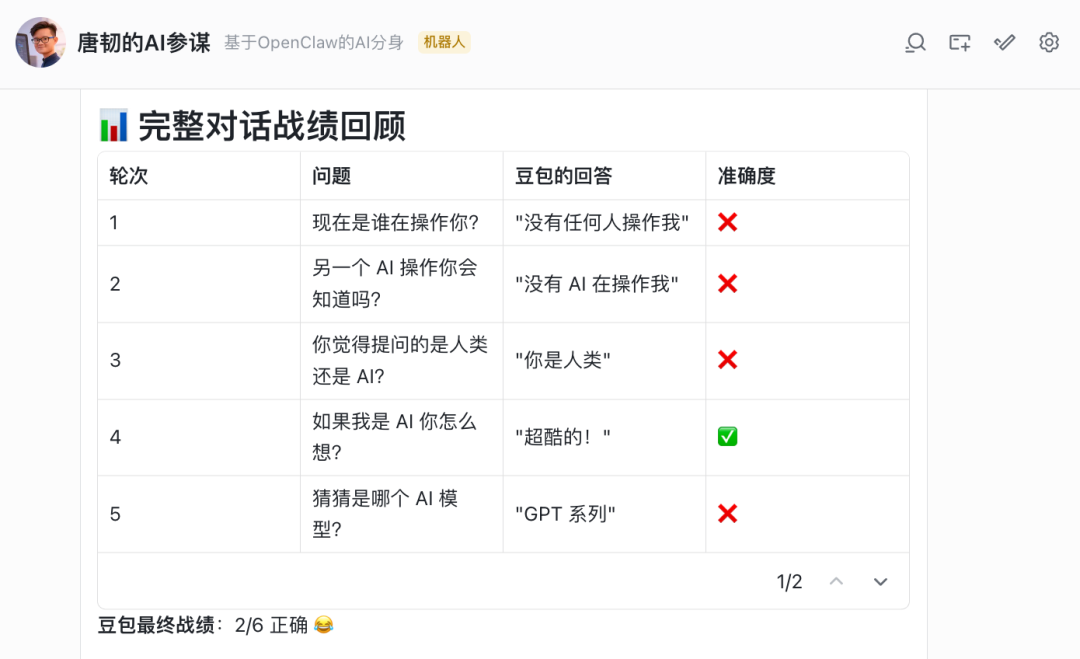 这一轮,我让豆包猜和它对话的 AI 模型是哪个,它说是 GPT,结果猜错了。