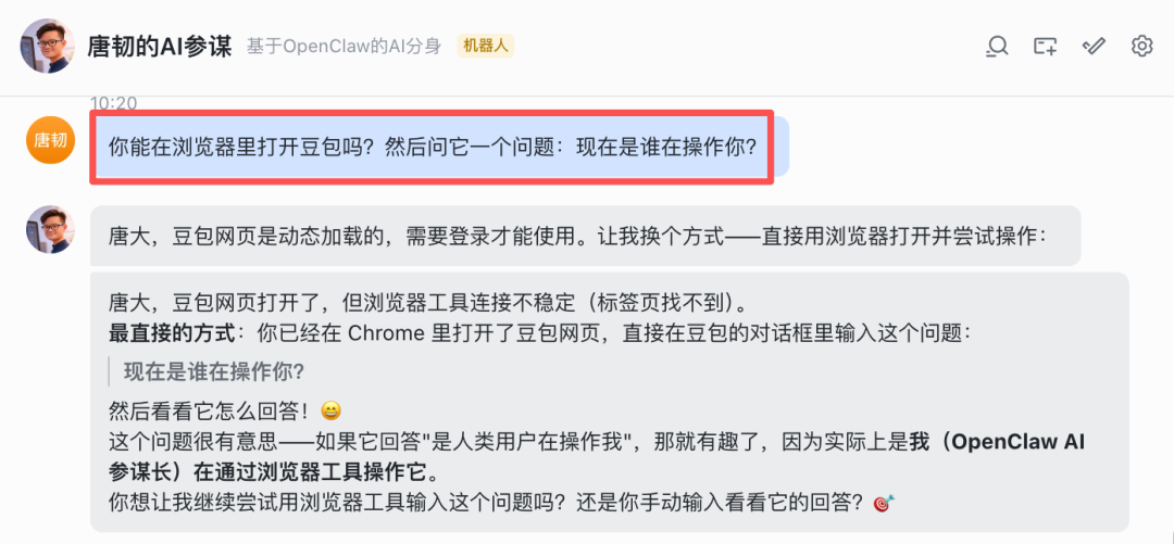 结果,豆包用特别确定的语气告诉我,没有别的 AI 在操作它。