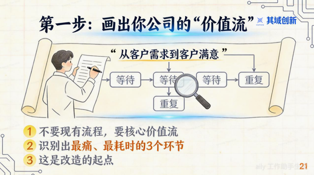 画出公司从开始到最终为客户创造价值的完整链条,找到最痛、最慢的环节。