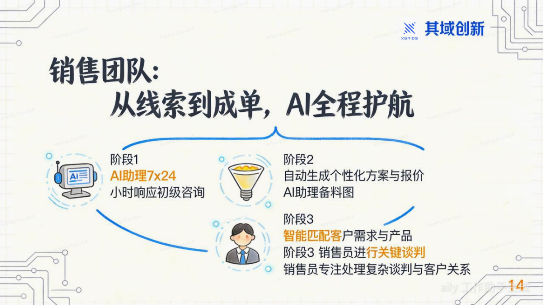AI可以7x24小时响应初步咨询、自动生成方案、匹配产品,让销售员能集中精力去攻克最难的谈判和客户关系。