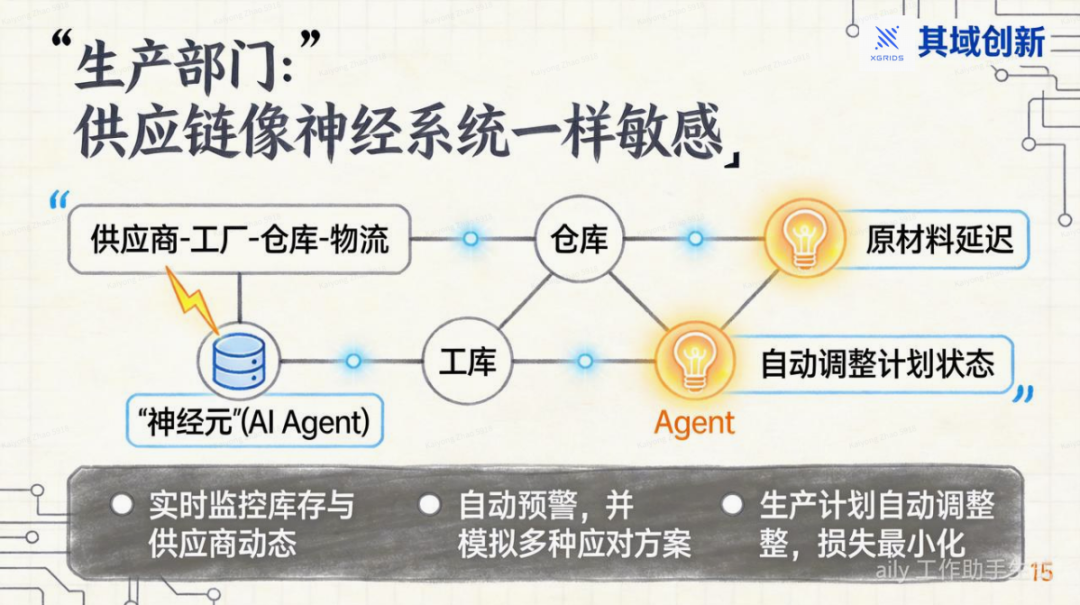 在各个环节植入AI智能体,让供应链像神经系统一样敏感,一旦某个环节出问题,它能立刻预警、模拟解决方案并自动调整生产计划,把损失降到最低。