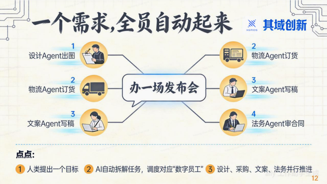 当人类提出一个目标,AI OS能自动拆解任务,并调度不同的“数字员工”(Agent)并行工作。企业从“人驱动流程”变成了“目标驱动系统”。