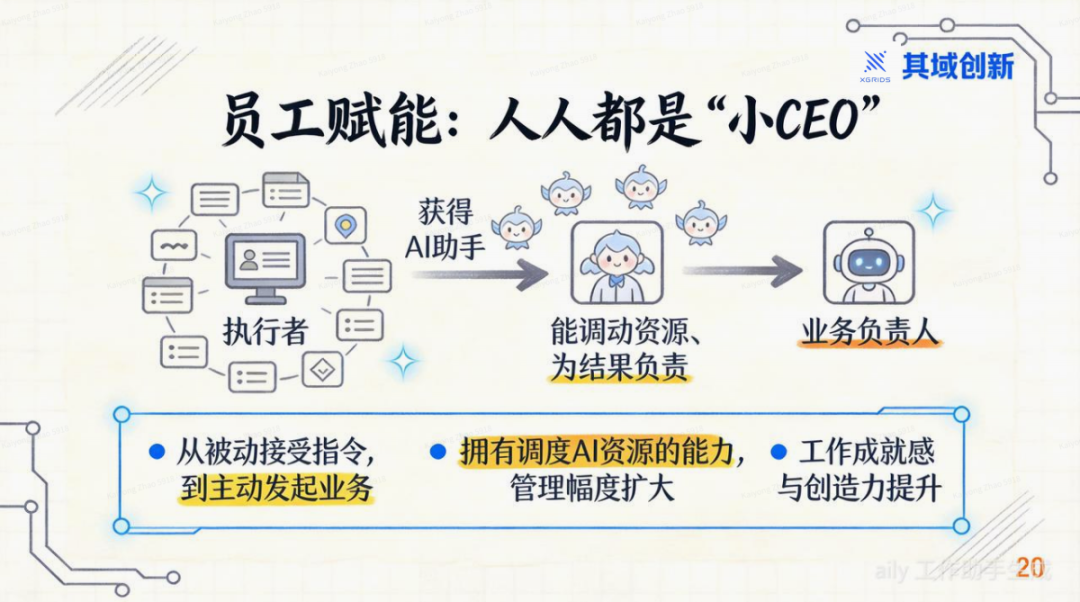 每个业务负责人都能调动AI资源,像“小CEO”一样为结果负责,工作自主性和创造力得到提升。