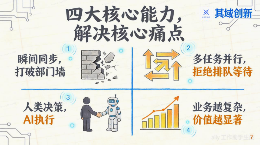 AI OS的核心价值在于:通过瞬间同步打破跨部门协作的篱笆,实现“人类决策,AI执行”的高效分工。