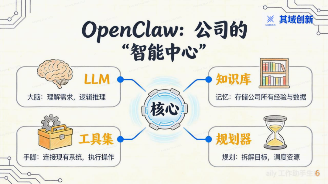 OpenClaw被定义为企业的“智能中心”,它集成了大模型的逻辑推理、知识库的经验记忆以及工具集的执行能力。这使得AI不再是边缘辅助,而是组织核心。