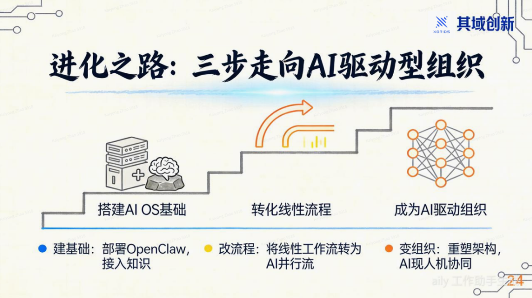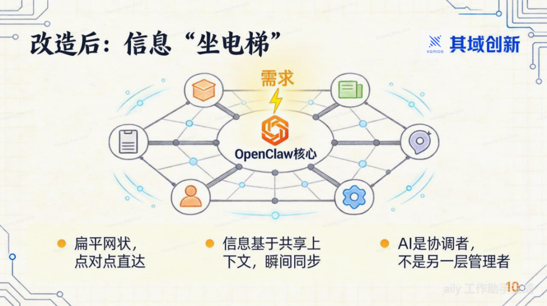通过AI OS的改造,组织进化为扁平化的网状结构,信息得以像“坐电梯”一样瞬间直达。AI在其中扮演智能协调者,确保所有成员基于共享的上下文进行协作。