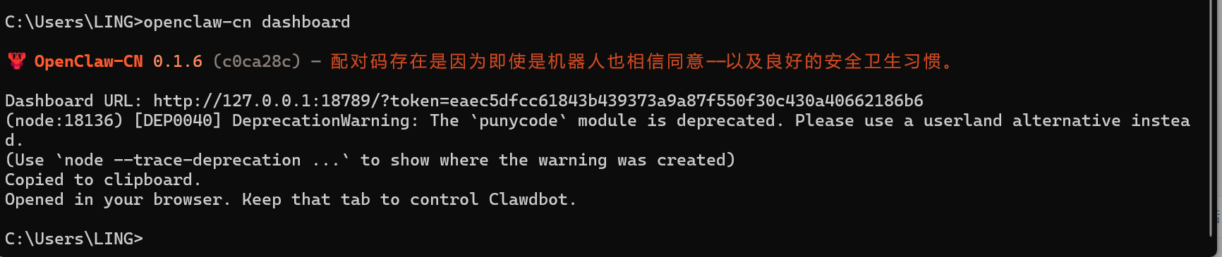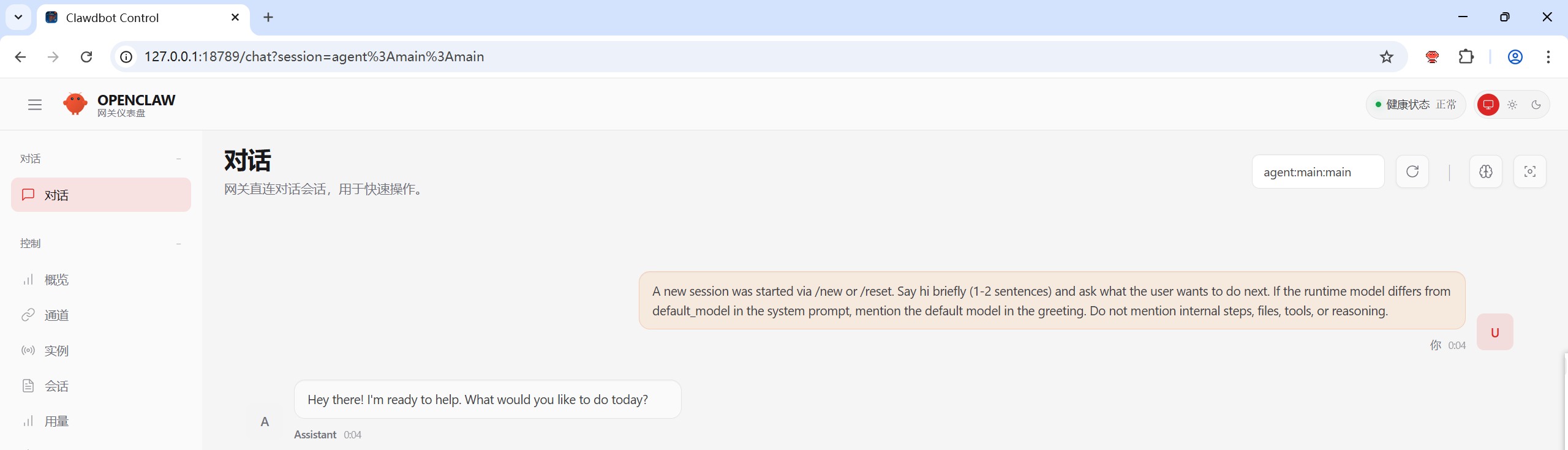 - 在 Windows 的命令行界面(CMD)中在命令行中输入,打开openclaw网页界面,如遇报错:让OpenClaw自我优化