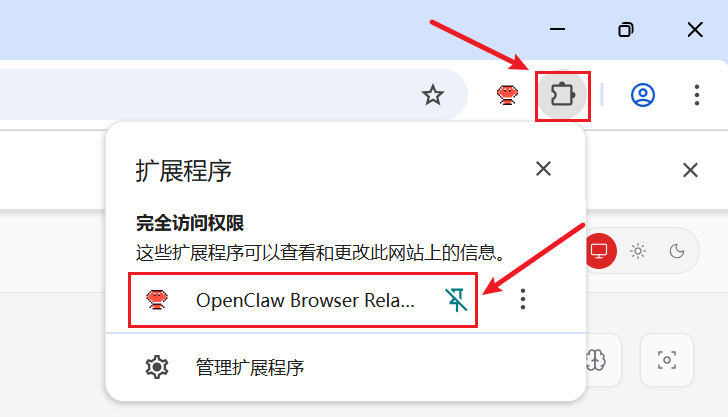 - 在右上角,点击扩展,点击“OpenClaw Browser Relay for Chrome”插件,选择固定到搜索栏里面