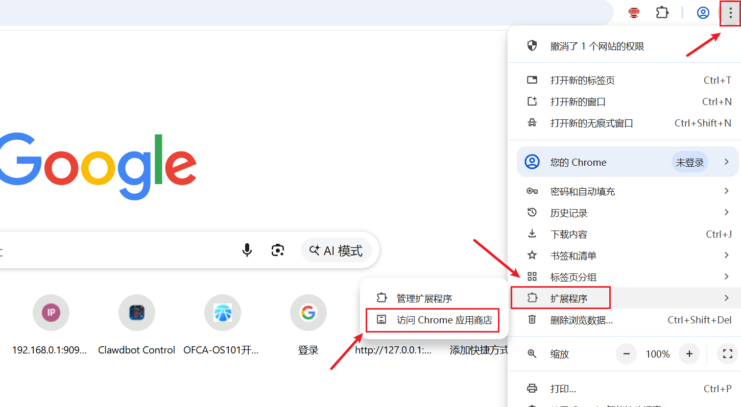 - 打开Chrome/点击右上角设/扩展程序/访问Chrome应用商店